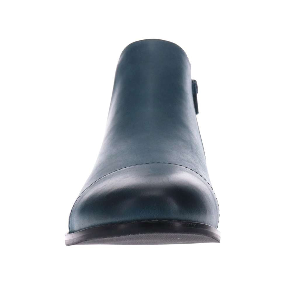 Leather slip on boot with side zip entry on rubber outsole with a wood dress heel. Designed and created with 100% genuine leather.